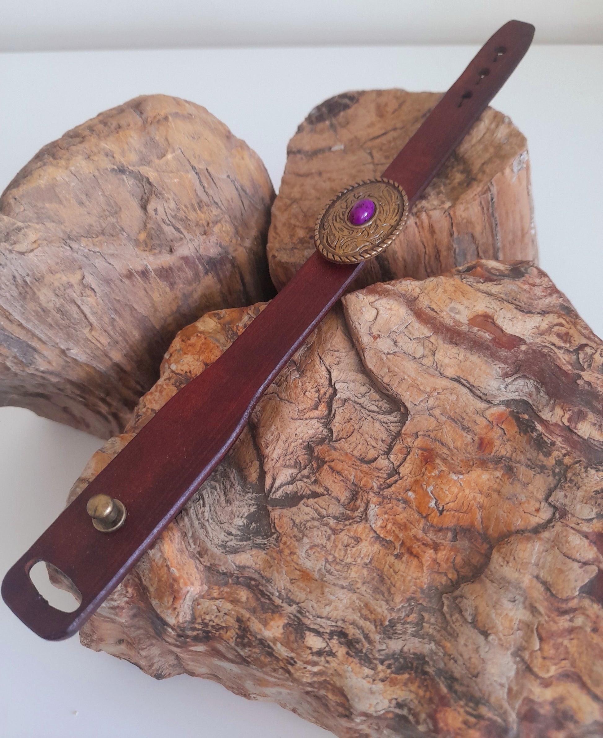 This whiskey tan leather bracelet with its purple round concho combines rustic charm with a modern twist, making it the perfect gift or a stunning addition to your collection!